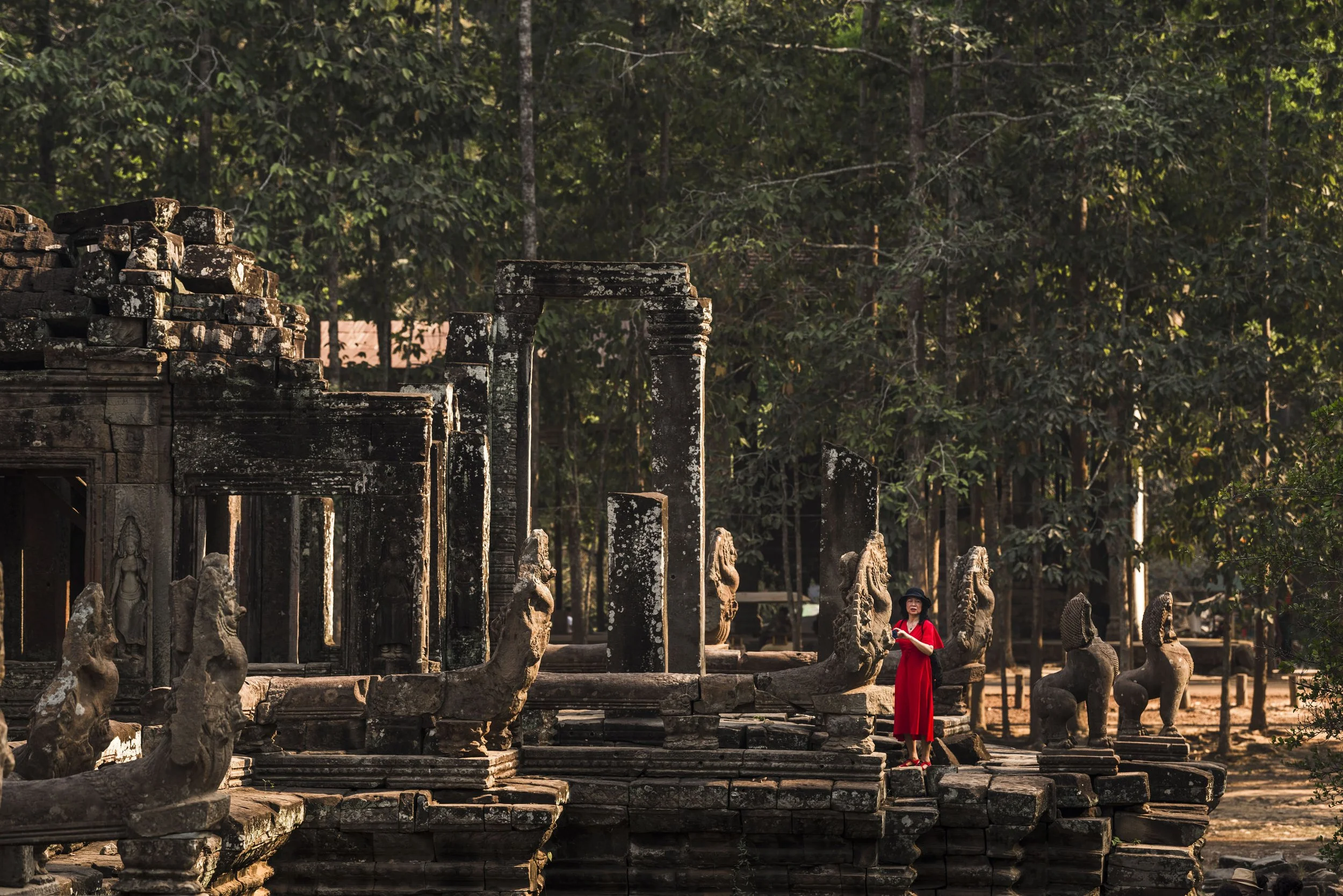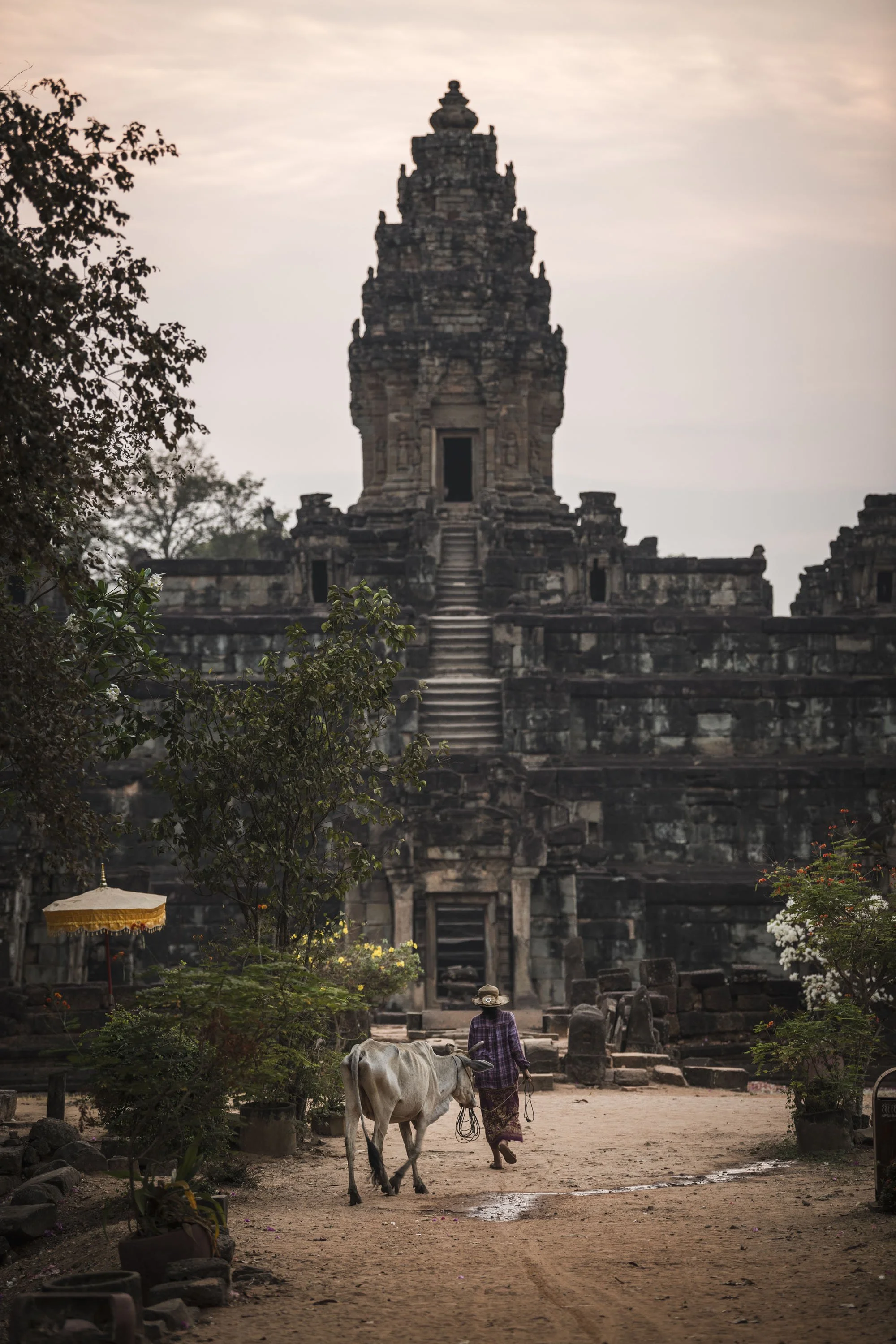Later in the day, I moved to Baphuon, inside the ancient city of Angkor Thom. This temple-mountain, dedicated to Shiva, was once known as the “Tower of Bronze.” Its monumental causeway leads to a massive three-tiered pyramid, which in the 11th century stood as one of the largest structures in Angkor. Although much of it collapsed over time, its partial reconstruction reveals the sheer ambition of the Khmer builders. Around the ruins, daily life unfolds naturally: I saw a villager leading his cow across the temple grounds, a timeless scene that seemed to echo the centuries-old bond between the people and these sacred stones.
